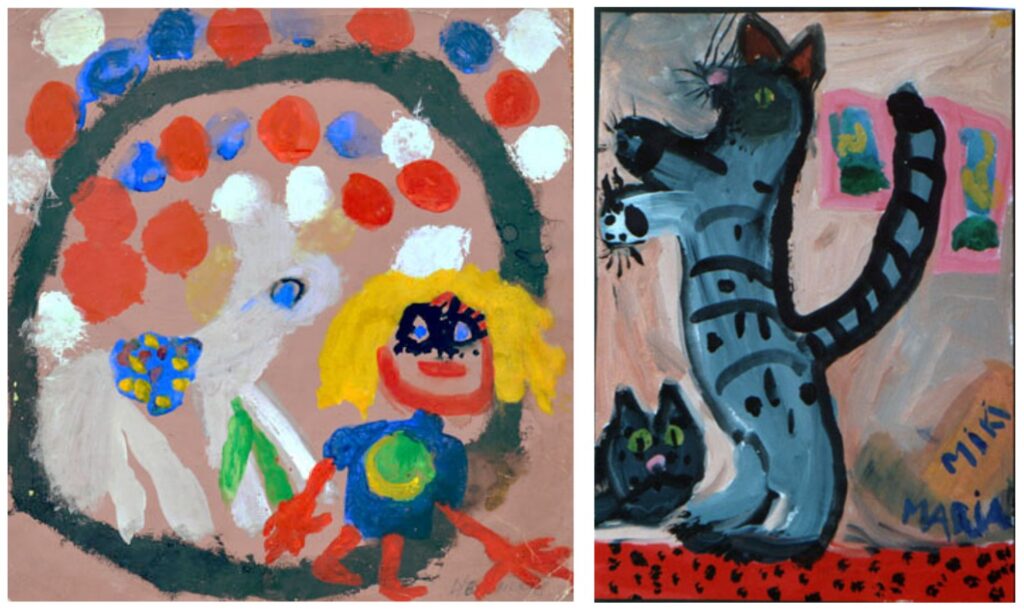 Vpravo Maria, 6 roků: Kocour Miki; rozměr 42 x 30 cm. Malířské provedení je modernisticky řešené.