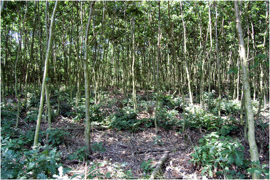Přirozeně vzniklá dubová mlazina – tříleté a patnáctileté stromy