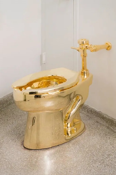 Možnost usednout na „zlatý trůn“ měli návštěvníci newyorského Guggenheim muzea v roce 2016. Zlatá mísa byla instalována místo klasické porcelánové v kabinkách veřejných toalet ve čtvrtém patře muzea. Návštěvníci, kteří nespěchali a byli ochotni vystát frontu, ji mohli skutečně použít. Nebyla na podstavci ani za plexisklem – byla připojena k vodě i kanalizaci.